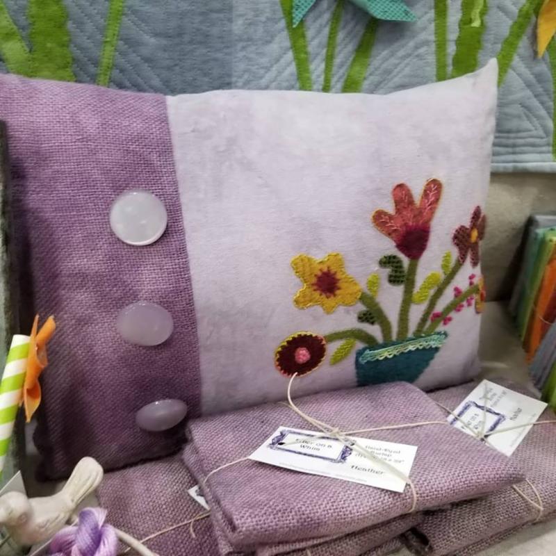 This pillow uses burlap and osnaburg in Heather; a new color introduced at market. The flower basket is wool applique, using Mary Flanagan Woolens.