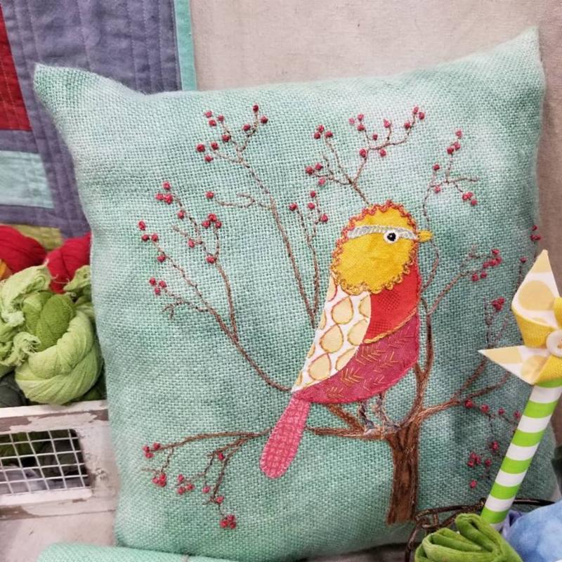 This pillow uses burlap and osnaburg in Heather; a new color introduced at market. The flower basket is wool applique, using Mary Flanagan Woolens.Tuscan Bird Pillow;